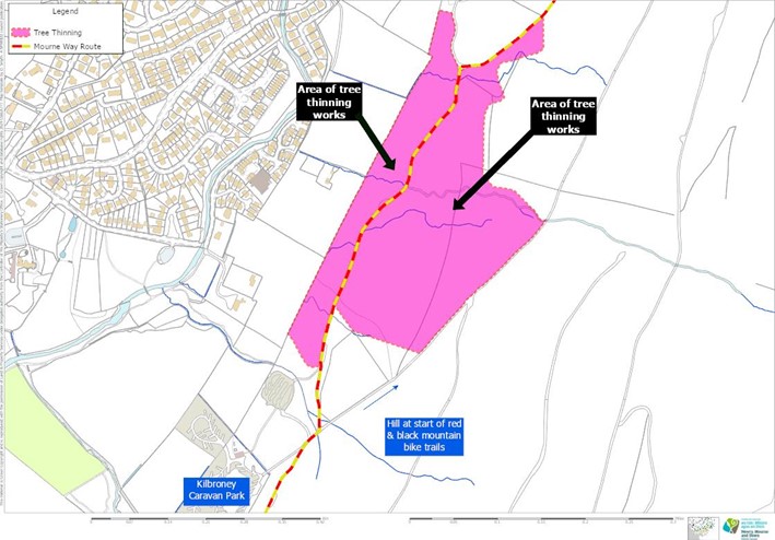 Machinery will be working to remove selected trees then stack these close to the road verge. Upon completion, haulage lorries will be operating in both directions on the Mourne Way to remove the harvested timber.